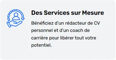Consultations de carrière personnalisées avec des coachs experts. Un CV sur mesure qui met en valeur votre histoire et vos compétences uniques. Un CV optimisé pour l’ATS qui attire l’attention des responsables du recrutement.